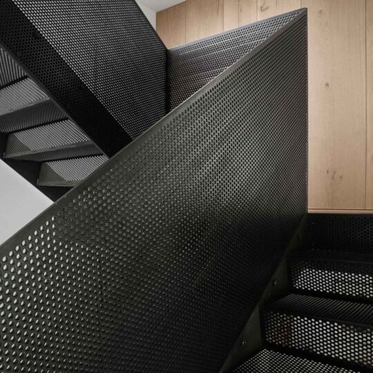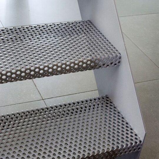 Τα διάτρητα φύλλα μπορούν να χρησιμοποιηθούν τόσο για τα σκαλοπάτια όσο και την κουπαστή. Αυτή η επιλογή σχεδίασης μπορεί να προσφέρει μία μοντέρνα και βιομηχανική αισθητική. Το διάτρητο μέταλλο λόγω των οπών παρέχει μία αντιολισθητική επιφάνεια κάτι που βελτιώνει αισθητά την ασφάλεια. Τα διάτρητα σκαλοπάτια παρέχουν επίσης βελτιωμένο αερισμό.